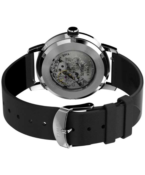Inspired by humanity's exploration of the universe, the Timex x Peanuts Space collection takes Snoopy and his friends to a whole new realm. Thanks to its ingenious design, the seconds hand lets you watch your favorite characters float and glide across the brushed silver sunburst dial, capturing the magic of zero gravity right on your wrist. We've paired this playful update with the Marlin Automatic, featuring a smooth-grained, eco-friendly black leather strap from the Leather Working Group (LWG), a convenient date window, luminescent hands, a domed acrylic crystal, and a 40mm polished recycled stainless steel case with a transparent caseback.